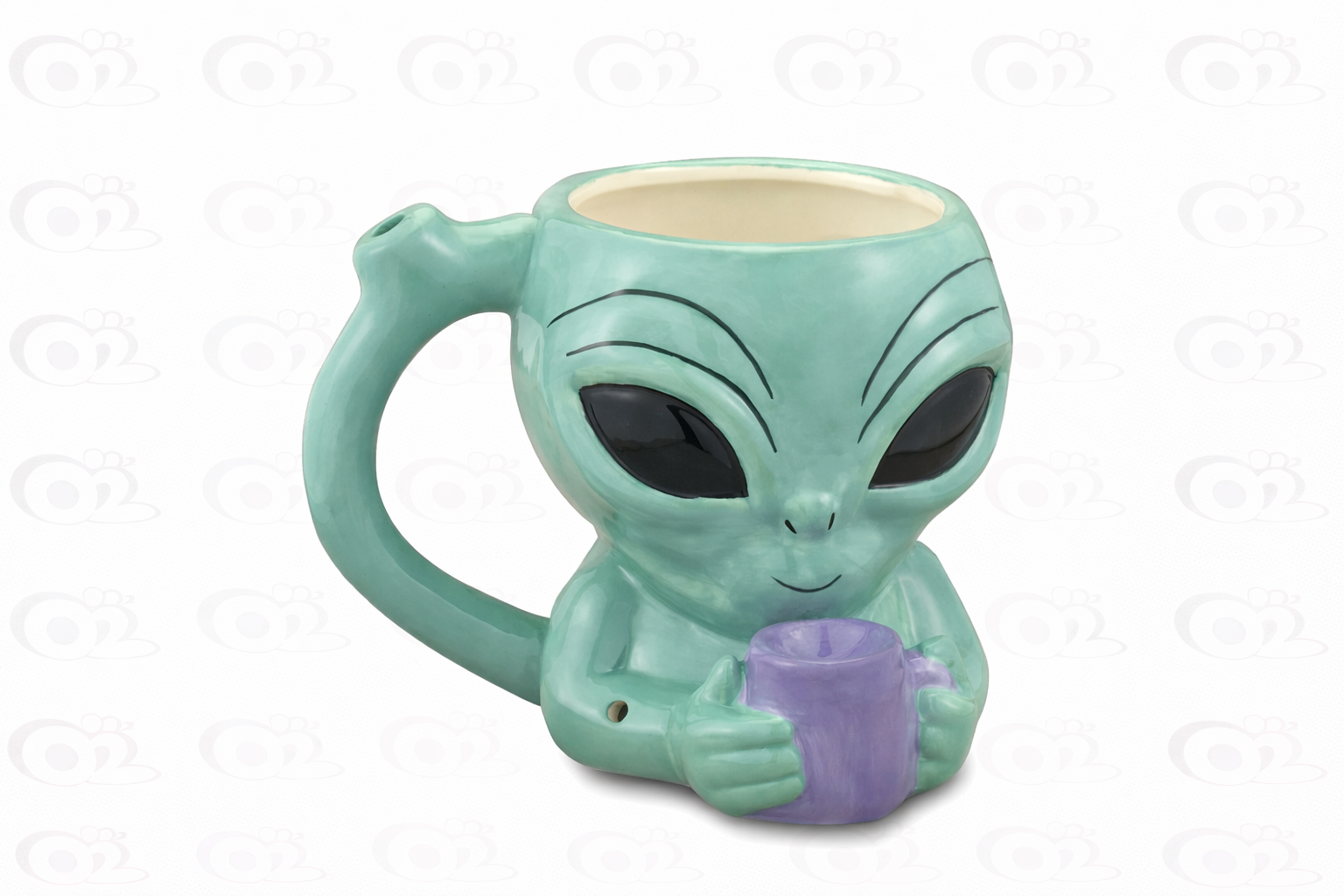 The Alien Pipe Mug is a novelty ceramic piece designed for customers who want playful design with functional use. Shaped like a friendly alien holding a mug, this piece doubles as a pipe-style novelty item, making it a unique addition to any collection.