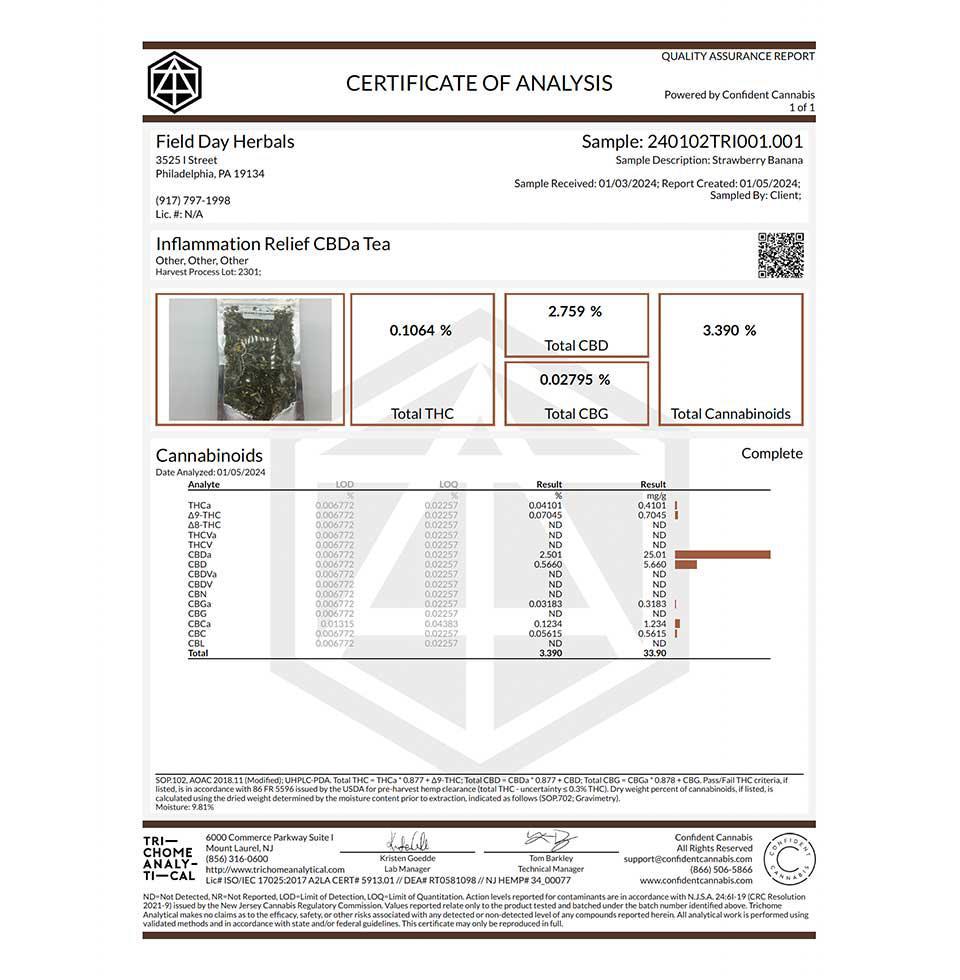 But hold up! There’s more to this tea than meets the eye. Our specially formulated tea also contains full spectrum CBDa, which is more bioavailable than traditional CBD and even helps fight inflammation in a way remarkably similar to that of NSAID chemical structures. With less than 0.3% THC, you can rest easy as you embark on this herbal adventure—it’s all federally compliant and well within the limits.