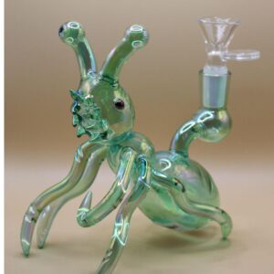 The Glass Termite Pipe is a uniquely designed novelty piece that blends art with functionality. Crafted from durable borosilicate glass, this pipe features a smooth iridescent green finish and a detailed termite-shaped body complete with antennae and segmented legs. Compact yet eye-catching, it’s both a conversation starter and a fully functional smoking piece.