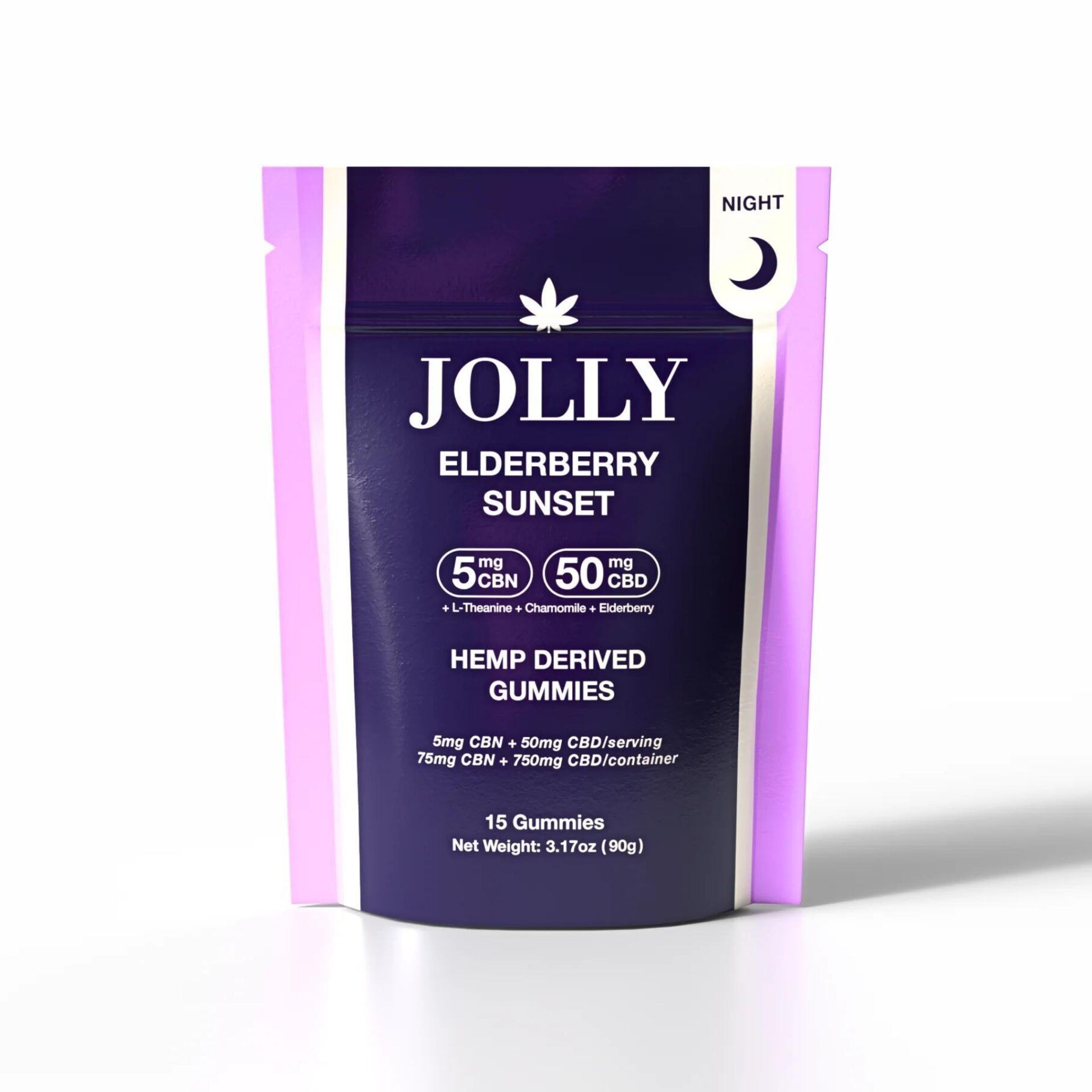 Jolly Elderberry Sunset Gummies (10CT) are formulated for nighttime relaxation and sleep support, blending 50mg of CBD with 5mg of CBN in each gummy to promote calm, comfort, and restful sleep—without THC. The elderberry flavor adds a soothing, nighttime-friendly taste that pairs perfectly with evening routines. This non-intoxicating formula helps ease the mind and body, making it easier to unwind and prepare for deep, restorative sleep. Ideal for consistent nightly use.
