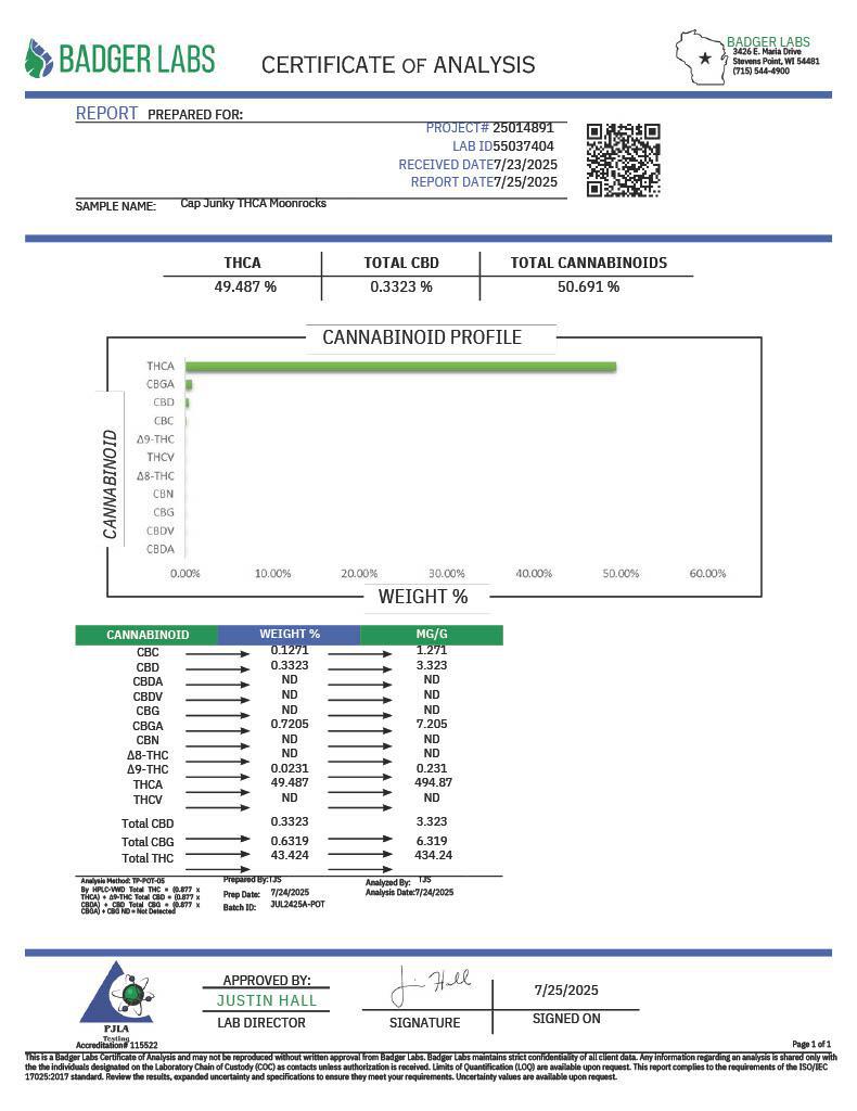 Enjoy Moon Rock – Cap Junky THCA Flower for its bold flavor, beautiful crystalline texture, and unmatched strength — a premium experience reserved for those who seek the very best in potency and flavor.