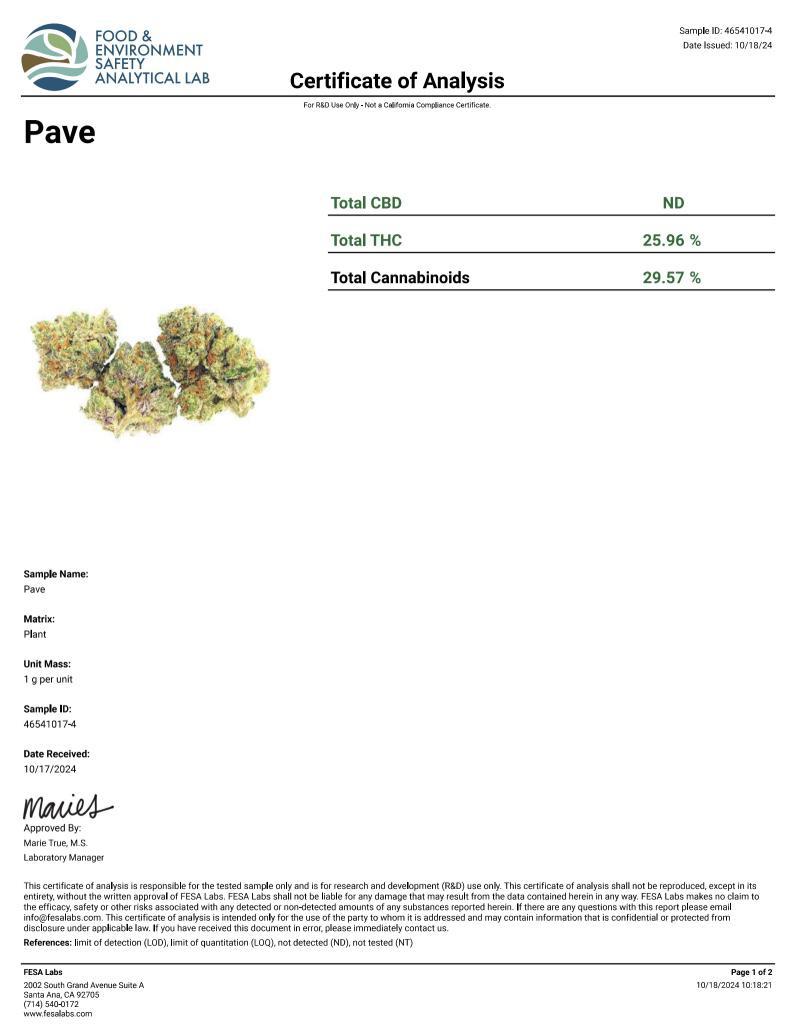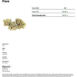 Genetics: Pave is a premium cross of Paris OG and The Menthol, combining the sedating effects and earthy richness of Paris with the minty freshness and potency of The Menthol. The result is a hybrid with strong indica influence and terpene-rich flavor.
