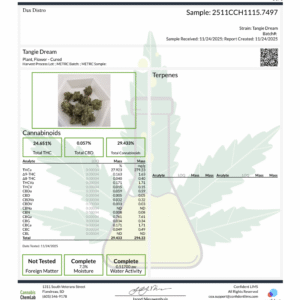 This strain provides an energetic, uplifting cerebral onset followed by a light, relaxed body feel without heaviness. Tangie Dream is well suited for daytime use, creativity, and staying social while remaining clear-headed and focused.
