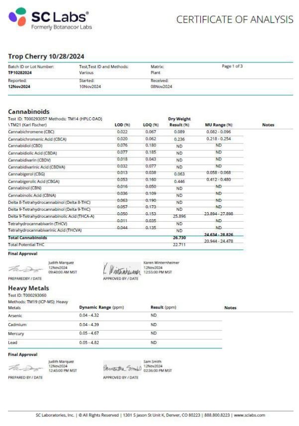 Dried cannabis flower is primarily consumed via inhalation. Effects typically begin within minutes and can last for several hours. Trop Cherry is a flavorful hybrid that delivers a fruity, citrus-cherry sweetness alongside a balanced, daytime-friendly high.